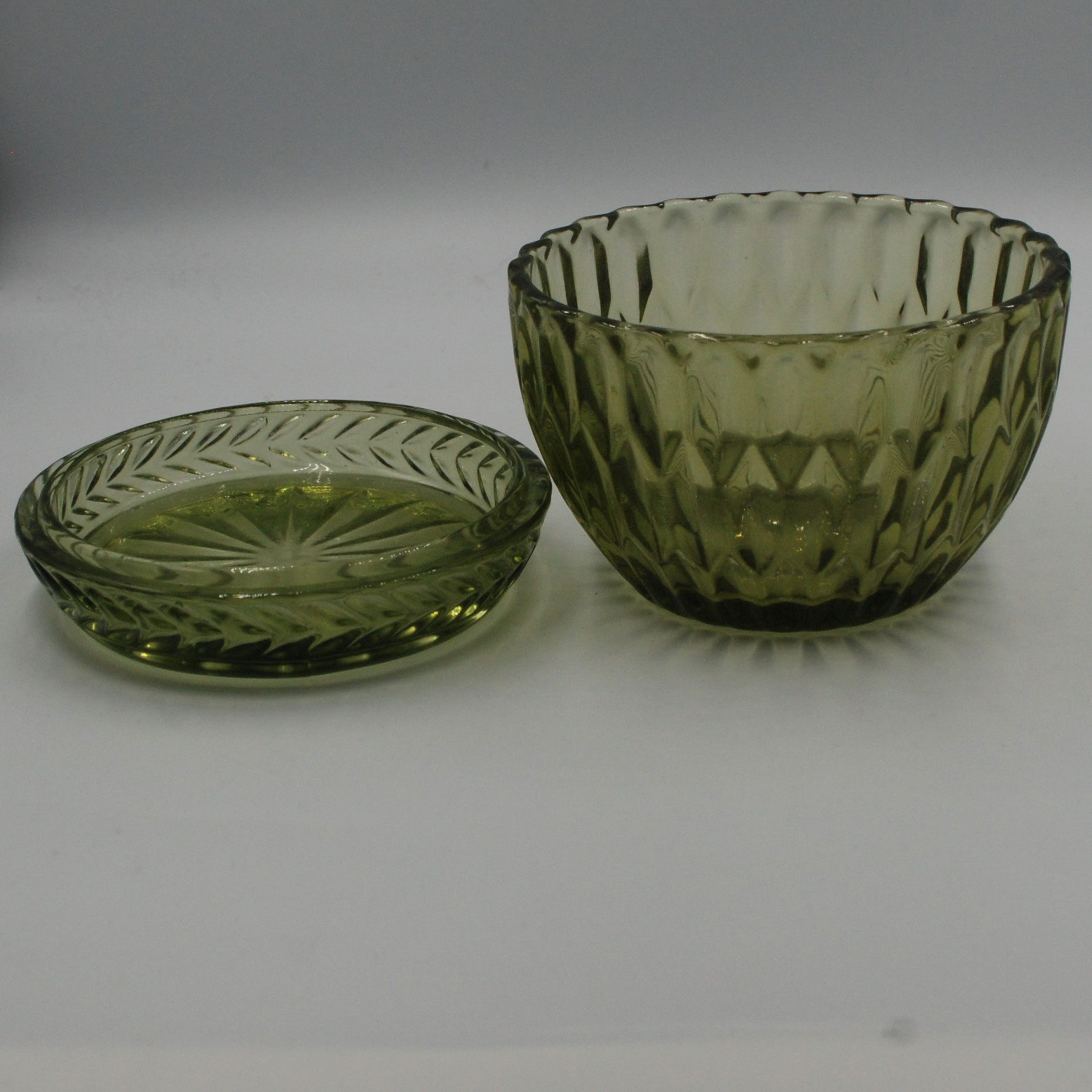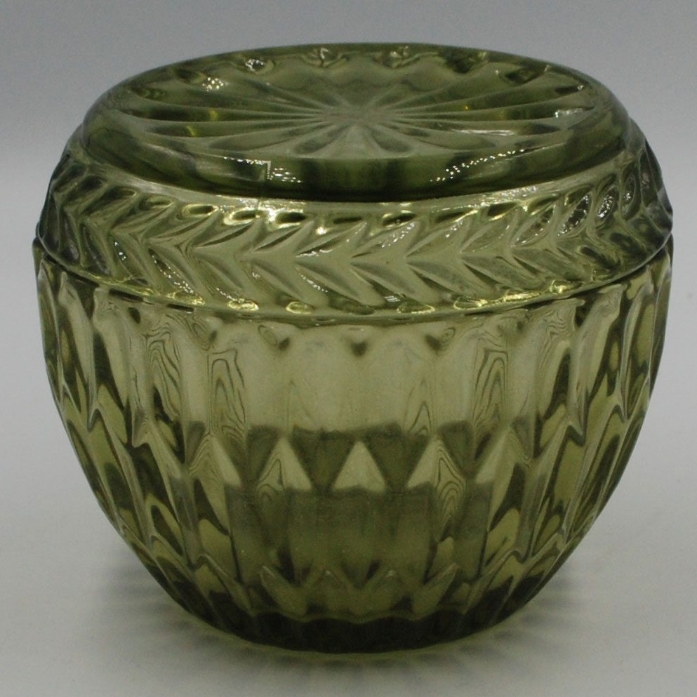 Glasskål grön med lock. Mått ca: H:8cm B:9,8cm. vikt:360g. Perfekt som godisskål, ljusskål mm.