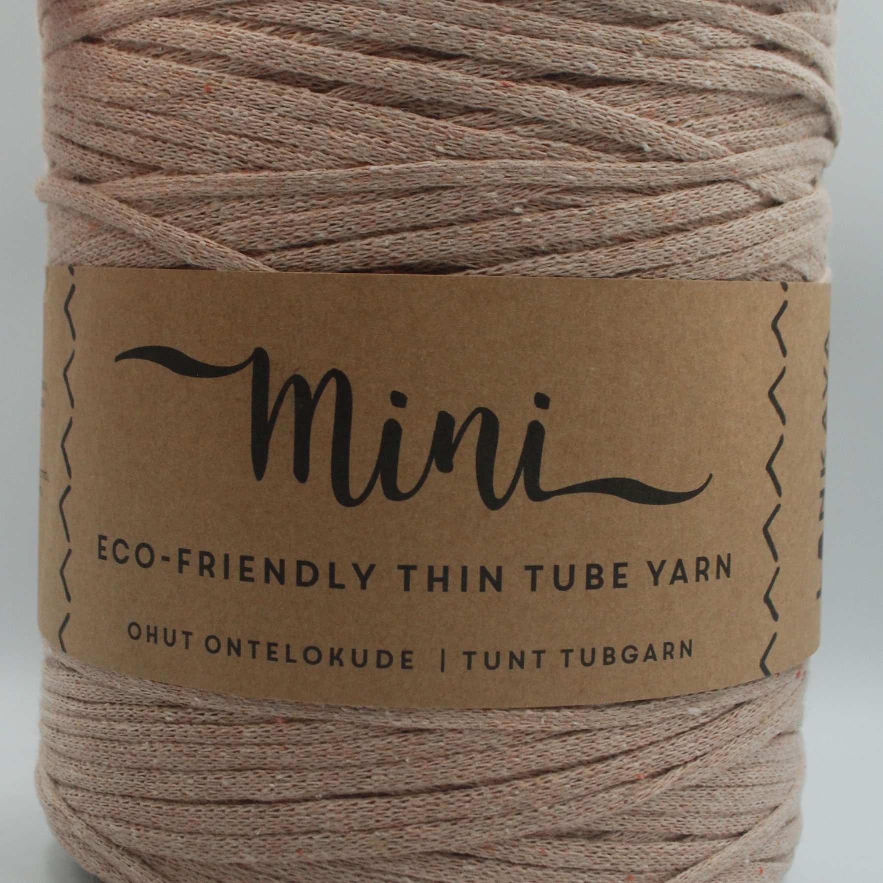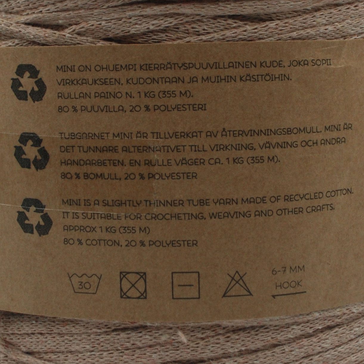 Stickor 20-20mm, virknål 6-7mm. 80% återvunnen bomull, 20% polyester Mini tubgarn är ett miljövänligt tubgarn tillverkat av återvunnen bomull.
