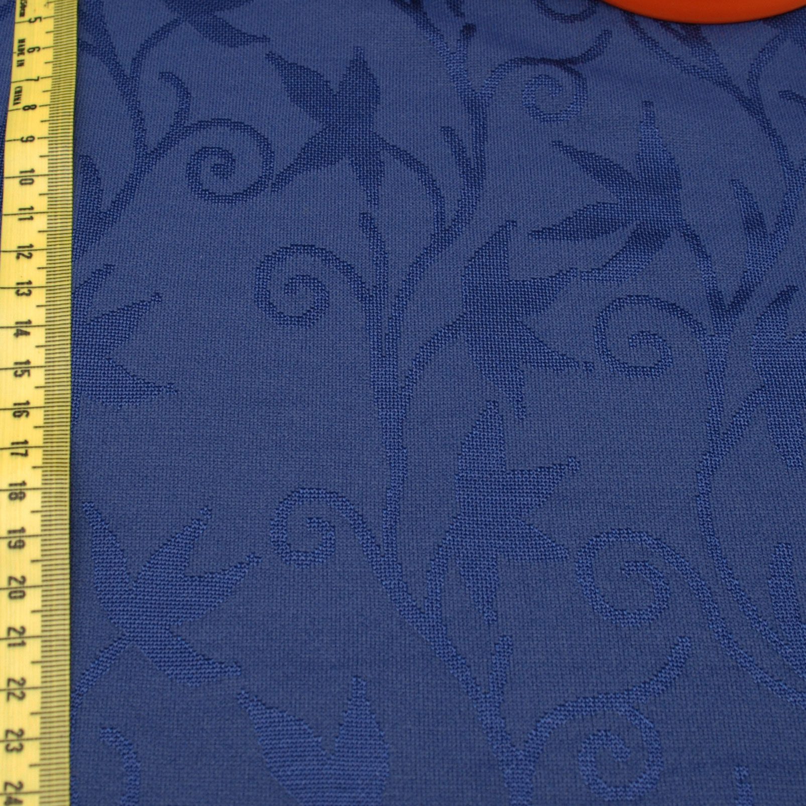 Tyg blå med blankt mönster lite sladdrig kvalitet. Bredd: 140cm. Vikt ca:270g/m2. Blötbergsboden med massor av tyger.