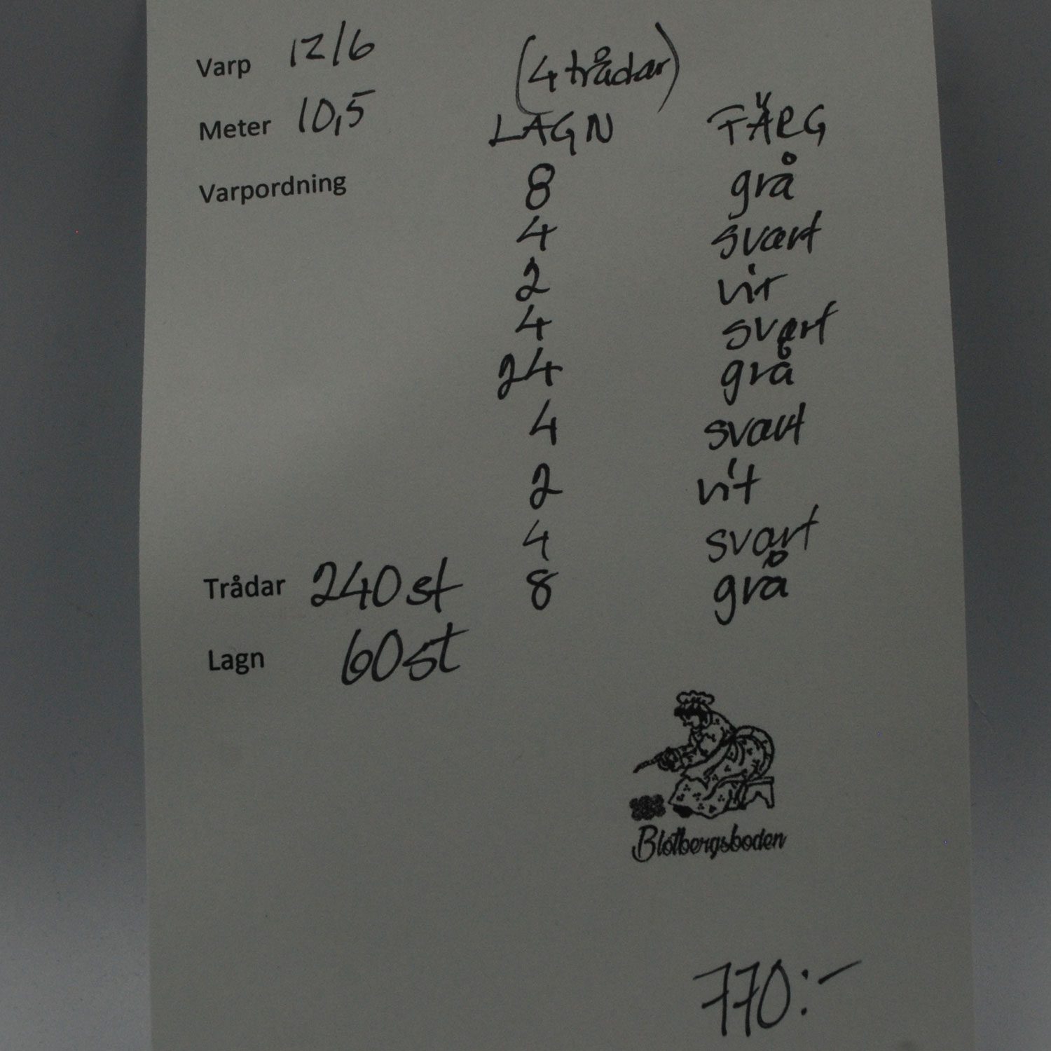 Varpfläta grå/svart/vit. 12/6 varp, 10,5 meter, 240 trådar, 60 lagn.